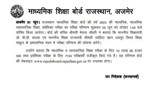 पिछले वर्ष, 2022 में, राजस्थान बोर्ड ने कक्षा 10वीं का परिणाम 13 जून को घोषित किया था। उस वर्ष, लगभग 10 लाख छात्रों ने परीक्षा दी थी, जिसमें से 82% छात्रों ने सफलता प्राप्त की थी। इस साल भी छात्रों की संख्या लगभग वैसी ही रहने की उम्मीद है।